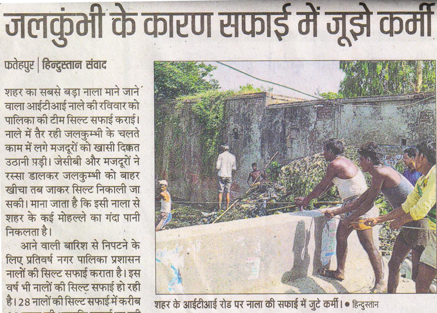 जलकुंभी के कारण सफाई में जूझे कर्मी ।