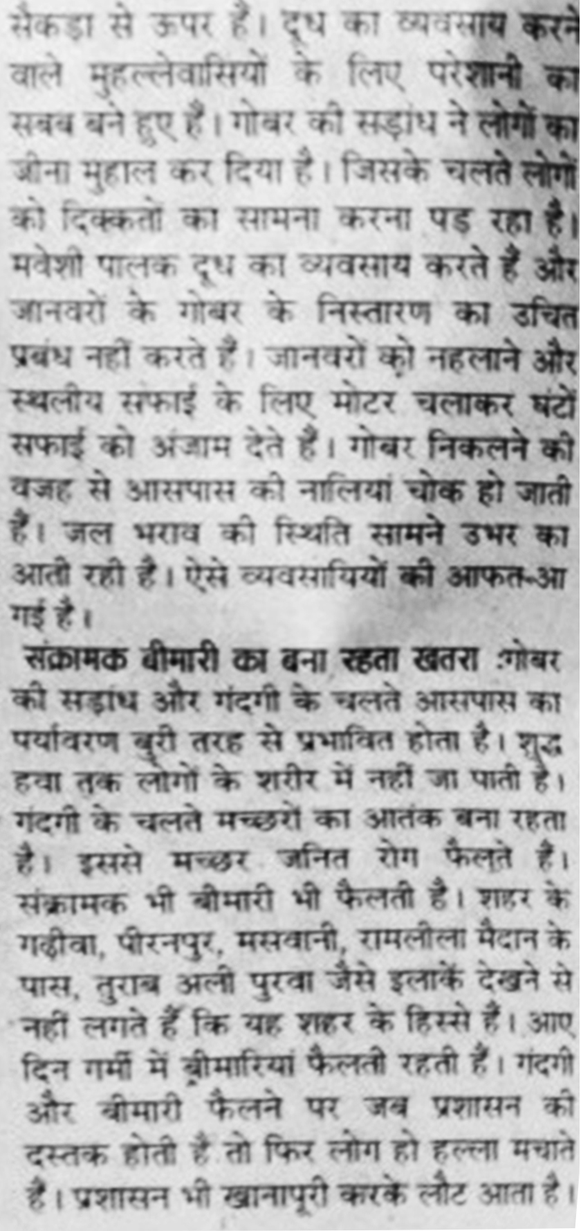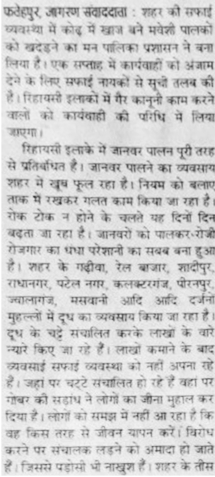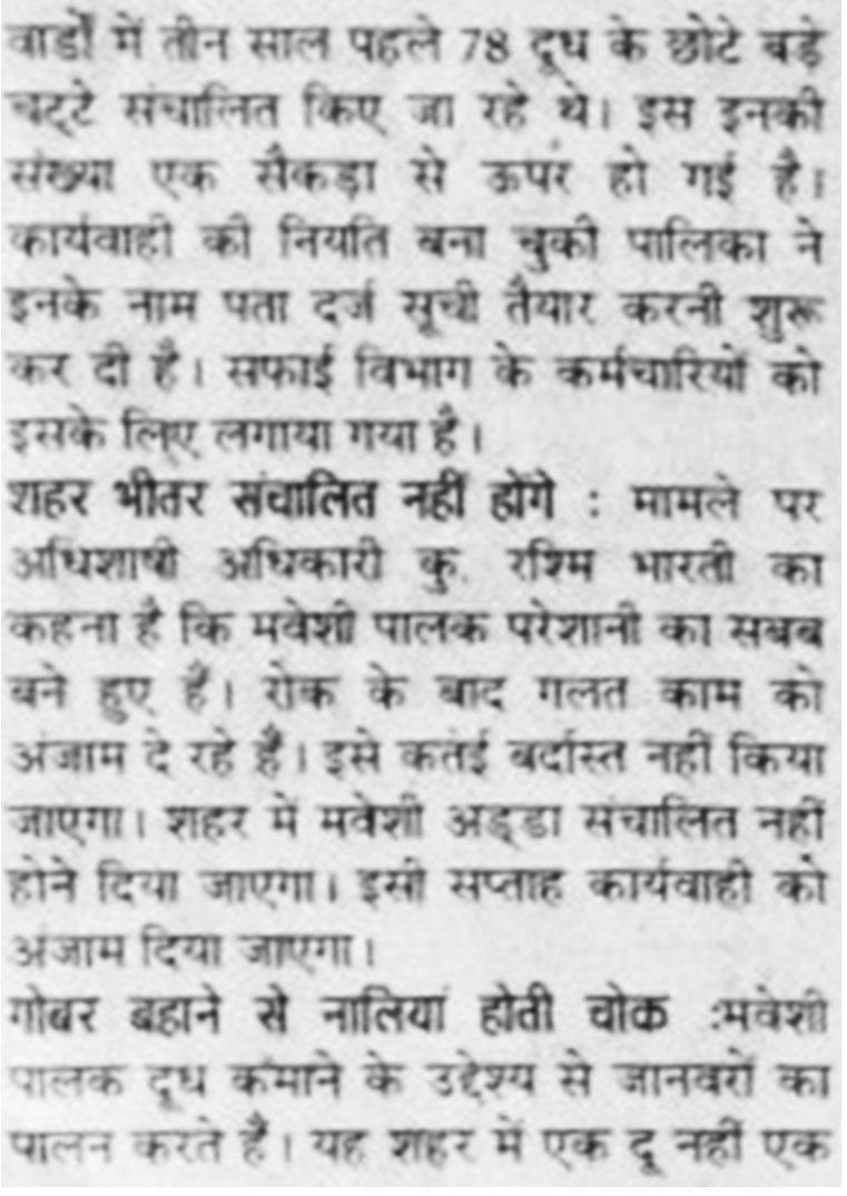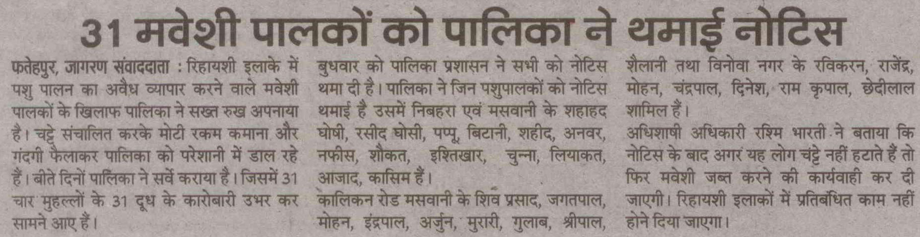 Qrsgiqj] nSfud tkxj.k laoknnkrk% fjgk;’kh bykds esa i’kq ikyu dk voS/k O;kikj djus okys eos’kh ikydksa ds f[kykQ ikfydk us l[r #[k viuk;k gSA pV~Vs lapkfyr djds eksVh jde dekuk vkSj xanxh QSykdj ikfydk dkss ijs’kkuh esa Mky jgs gSaA chrs fnuksa ikfydk us losZ djk;k gSA ftlesa 31 pkj eqgYyksa ds 31 nw/k ds dkjksckjh mHkj dj lkeus vk;s gSaA cq/kokj dks ikfydk Á’kklu us lHkh dks uksfVl Fkek nh gSA ikfydk us ftu i’kqikydksa dks uksfVl FkekbZ gS mlesa fucgjk ,oa elokuh ds ’kgknr ?kks"kh] jlhn ?kks"kh] iIiw] fcVkuh] 'kghn] vuoj] uQhl] 'kkSdr] bf’r[kkj] pqUuk] fy;kdr] vktkn] dkfle gSaA