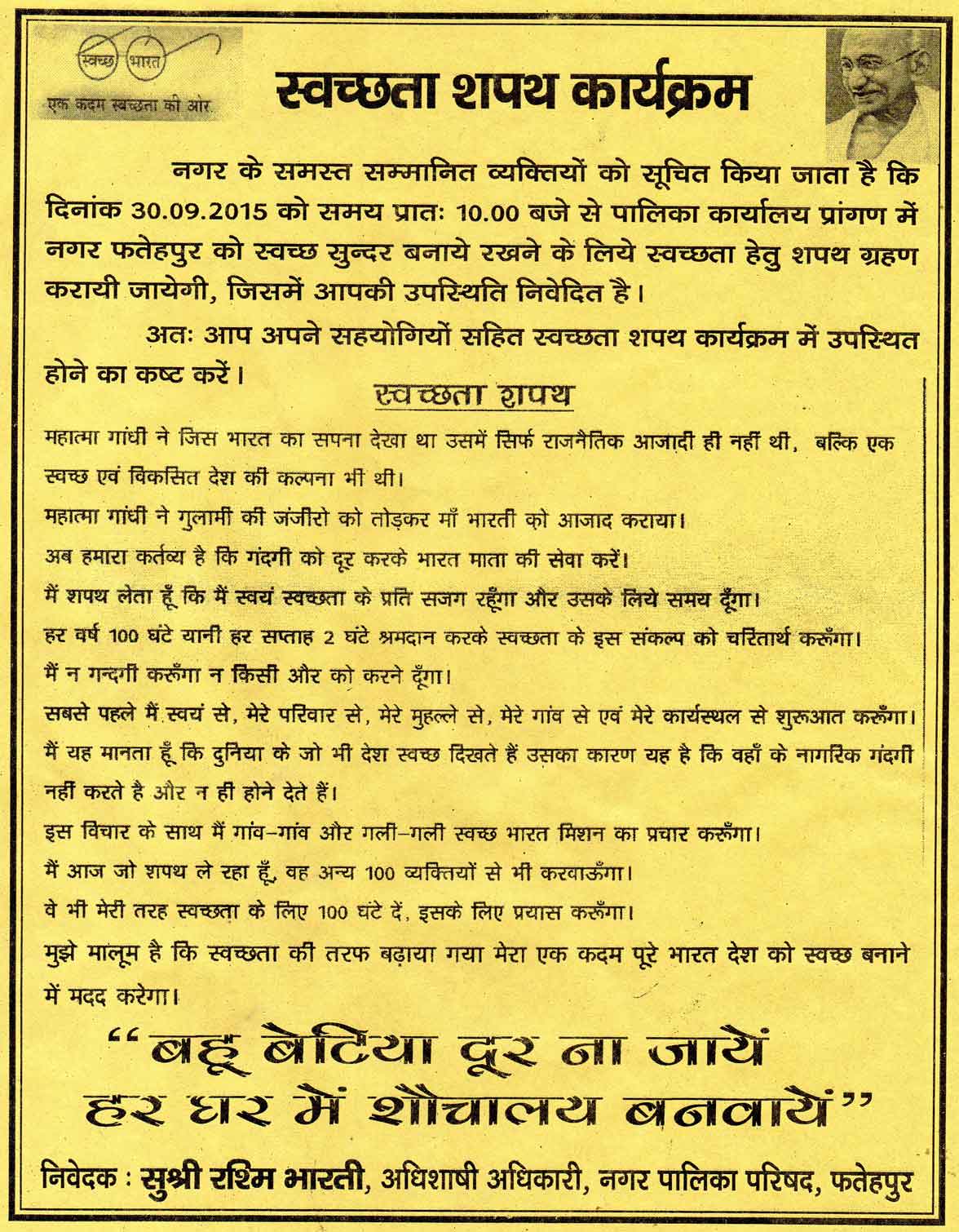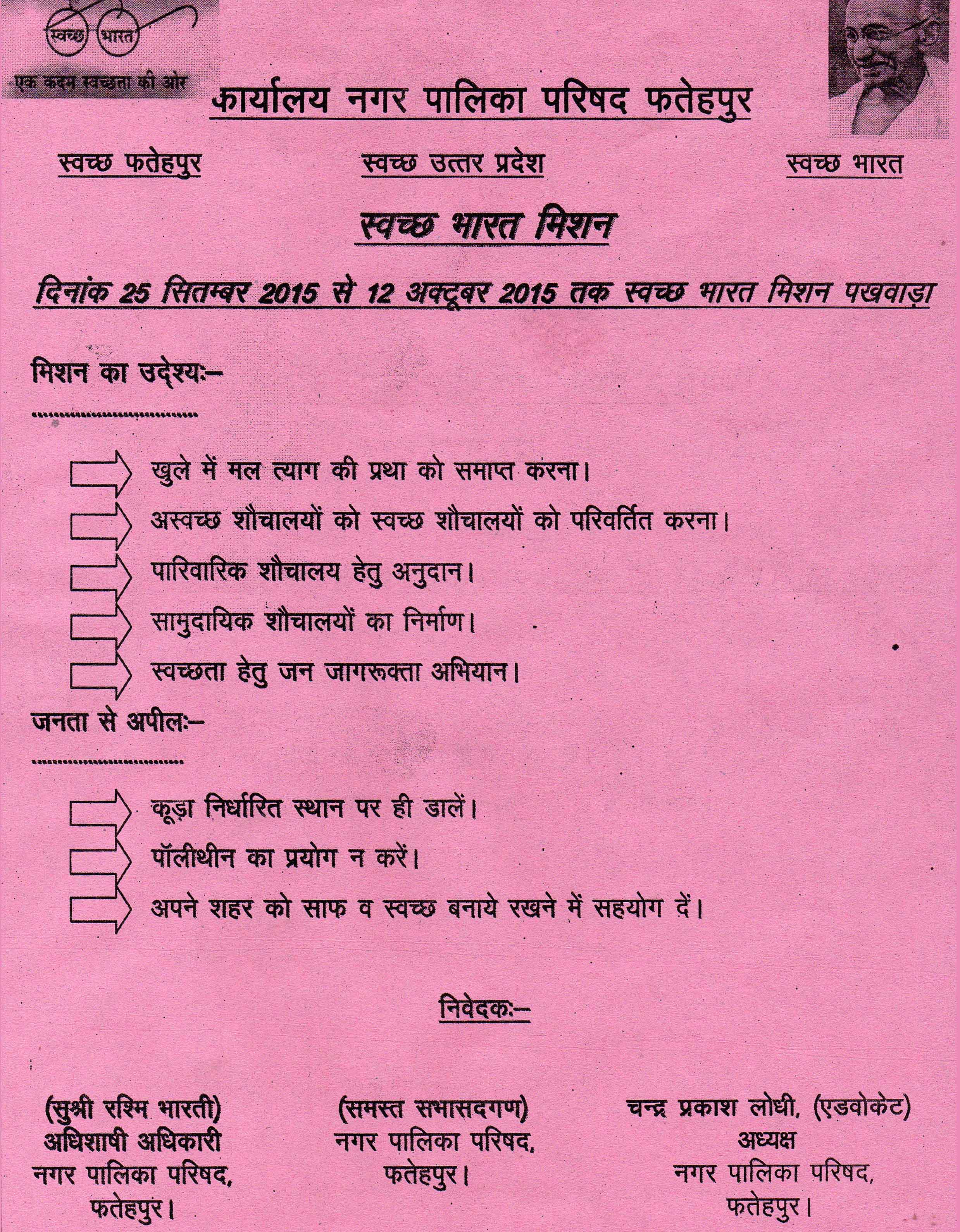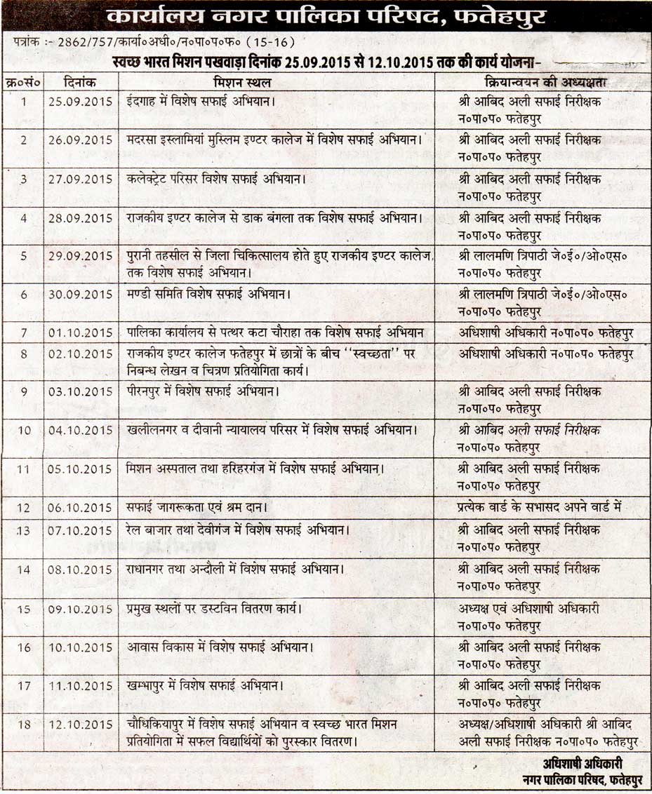 स्वच्छ भारत मिशन पखवाड़ा 25-09-2015 से 12-10-2015 तक की कार्य योजना