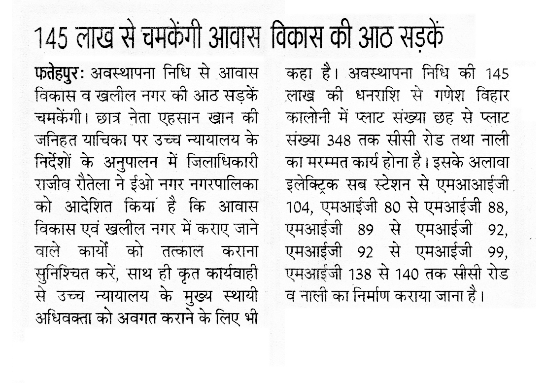 अवस्थापना निधि से आवास विकास व खलील नगर की आठ सड़कें चमकेंगी। छात्र नेता एहसान खान की जनहित याचिका पर उच्च न्यायालय के निर्देषों के अनुपालन में जिलाधिकारी राजीव रौतेला ने ईओ नगर पालिका को आदेषित किया है कि आवास विकास एवं खलील नगर