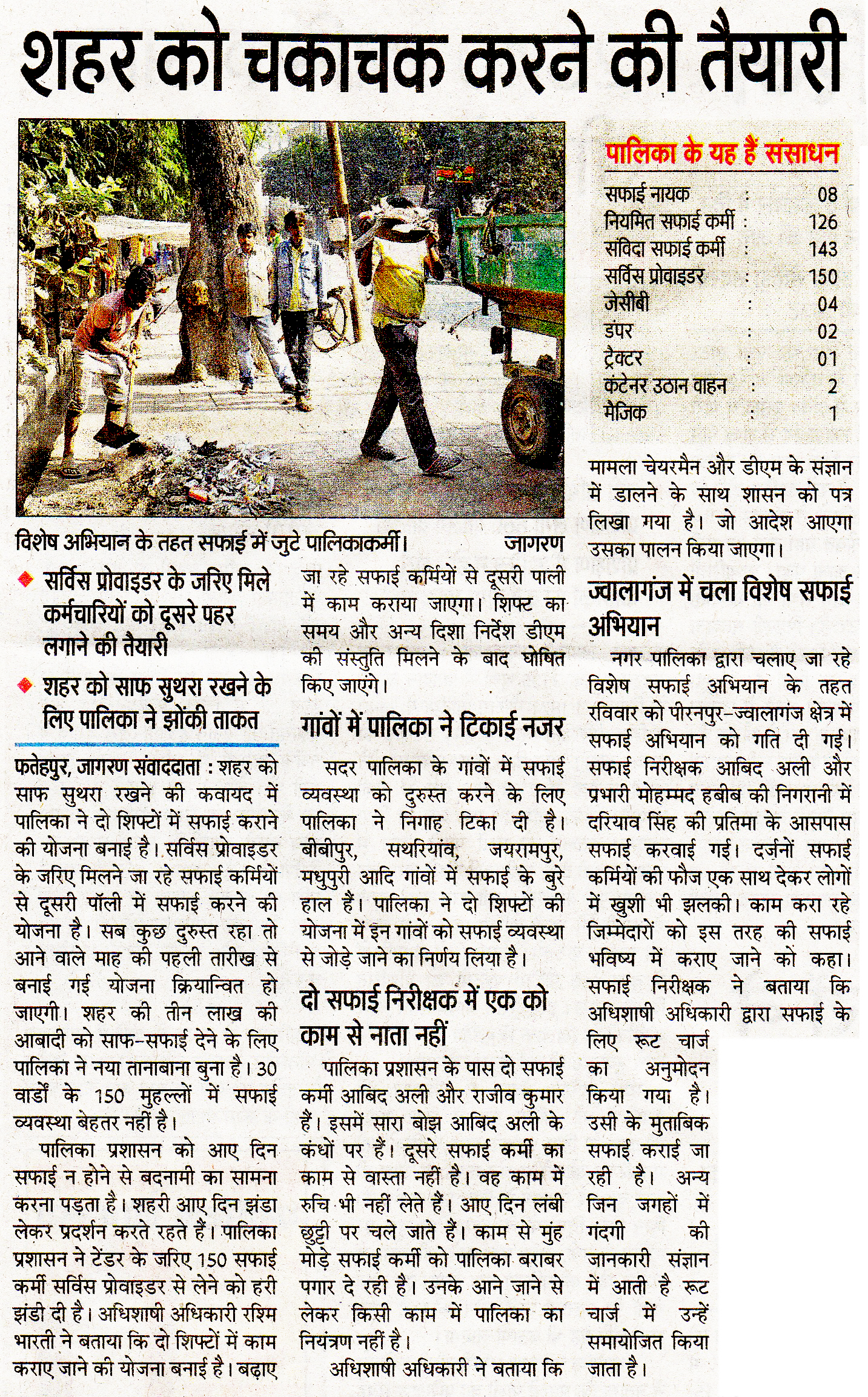 शहर को साफ-सुथरा रखने के लिए पालिका ने झोंकी ताकत। शहर को साफ-सुथरा रखने की कवायद में पालिका ने दो षिफ्टों में सफाई कराने की योजना बनायी है। सर्विस प्रोवाइडर के जरिए मिलने जा रहे सफाई कर्मियों से दूसरी पाॅली में सफाई करने की योजना