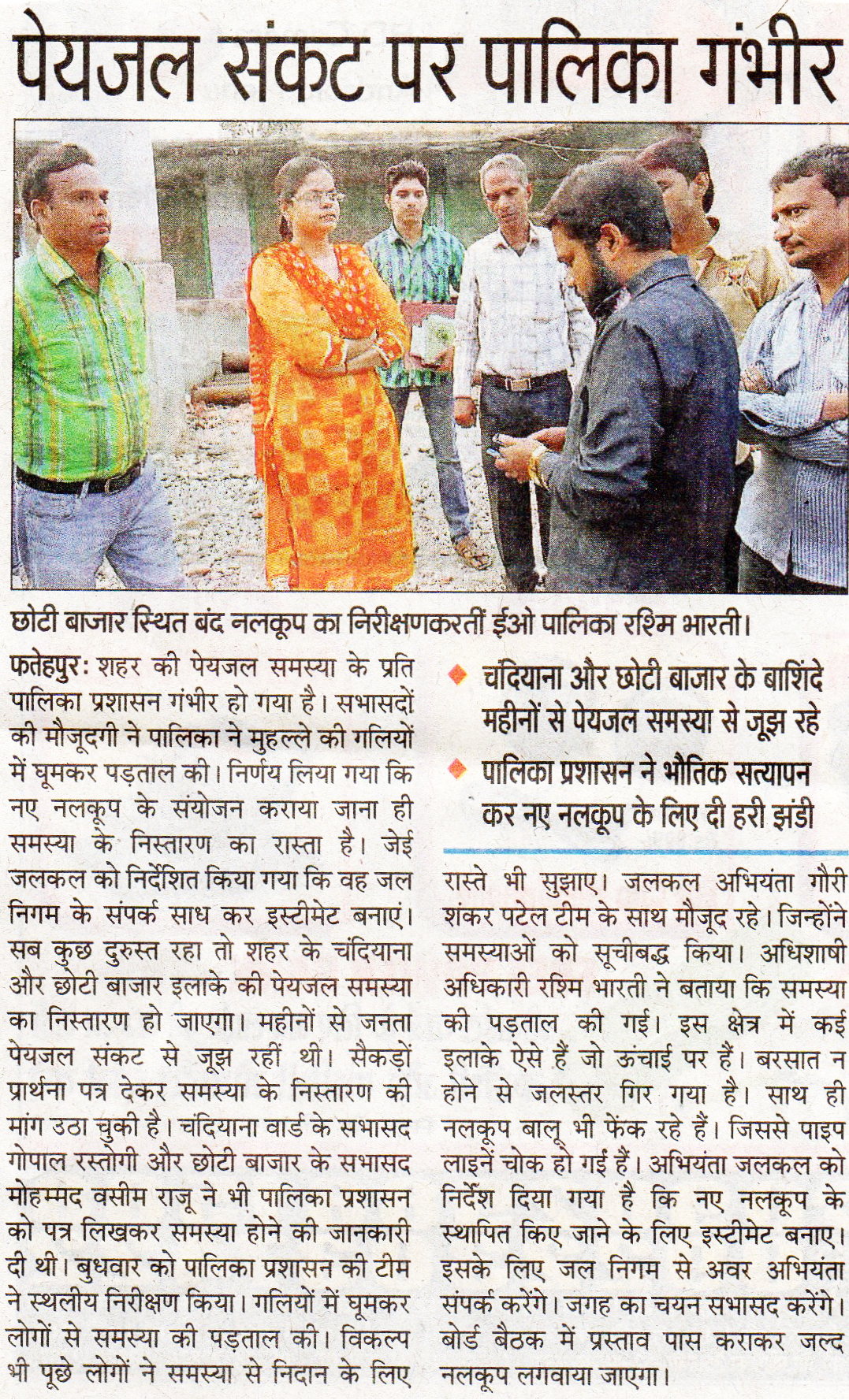 शहर की पेयजल समस्या के प्रति पालिका प्रषासन गंभीर हो गया है। सभासदों की मौजूदगी में पालिका ने मुहल्ले की गलियों में घूमकर पड़ताल की। निर्णय लिया है कि नए नलकूप के संयोजन कराया जाना ही निस्तारण का रास्ता है। जेई जलकल को निर्देषित
