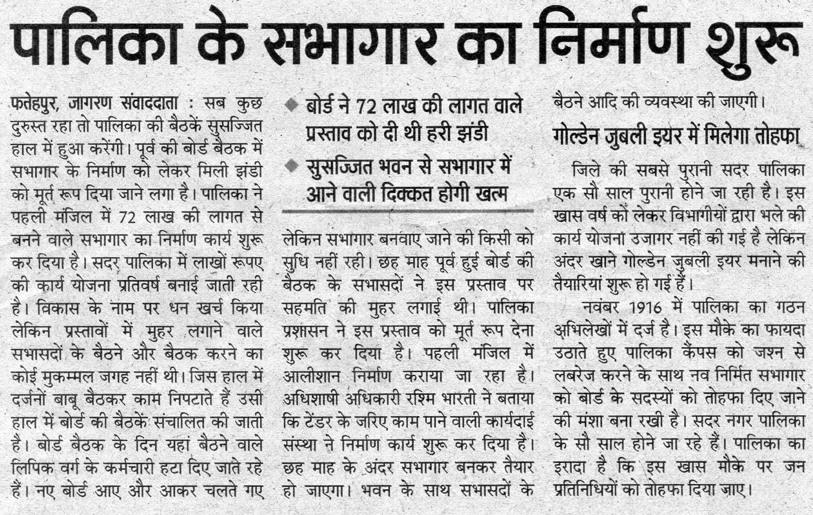 पूर्व की बोर्ड बैठक में सभागार के निर्माण को लेकर मिली झंडी को मूर्त रूप दिया जाने लगा है। पालिका ने पहली मंजिल में 72 लाख की लागत से बनने वाले सभागार का निर्माण कार्य शुरू कर दिया है। सदर पालिका में लाखों रूपये की कार्य योजना